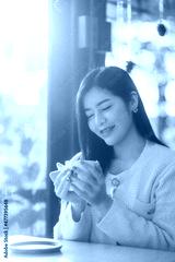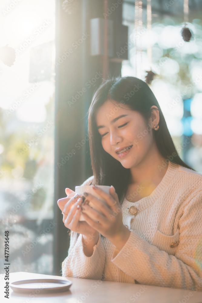 Portrait beautiful young asian woman girl wearing warm clothes enjoys drinking holding of positive the having cup of coffee,milk or chocolate at house home in the living room inside or cafe