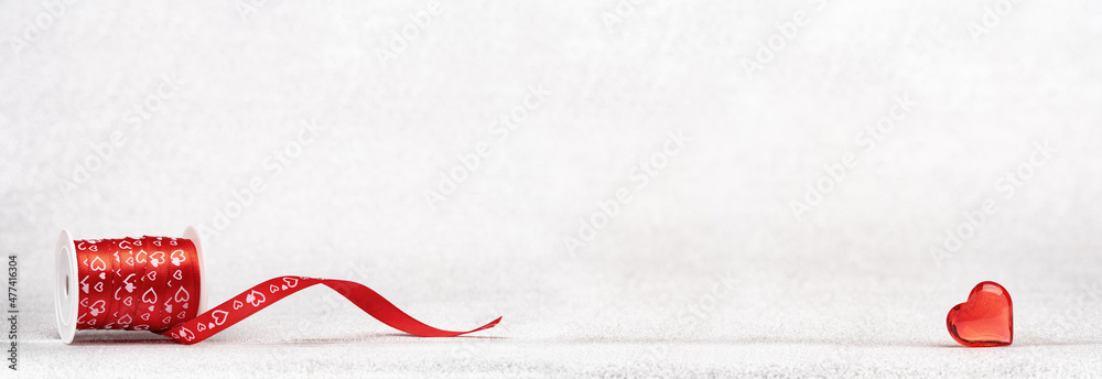 A roll of red gift ribbon with hearts for St Valentines day or 14 February. Glass heart. Minimal wide banner with copy space