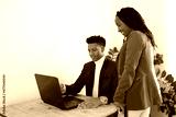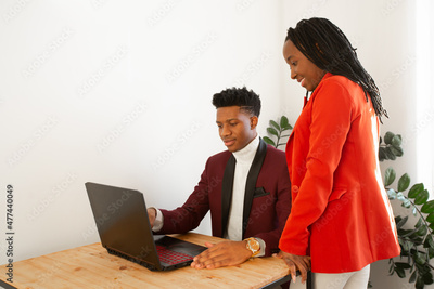 business discussion behind a laptop in the office of two managers