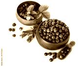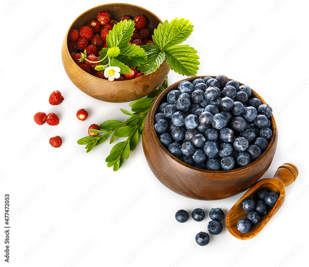 Berry blueberry and wild strawberry in wooden dish with green leaves and flower. Fruity still life. Healthy eating, isolated on white background.
