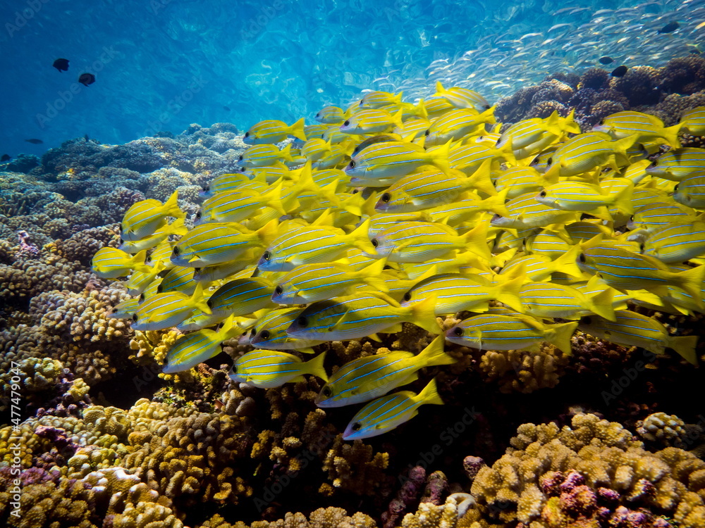 Blue striped grunts shoaling over the healthy coral reefs of Fakarava atoll, French Polynesia.