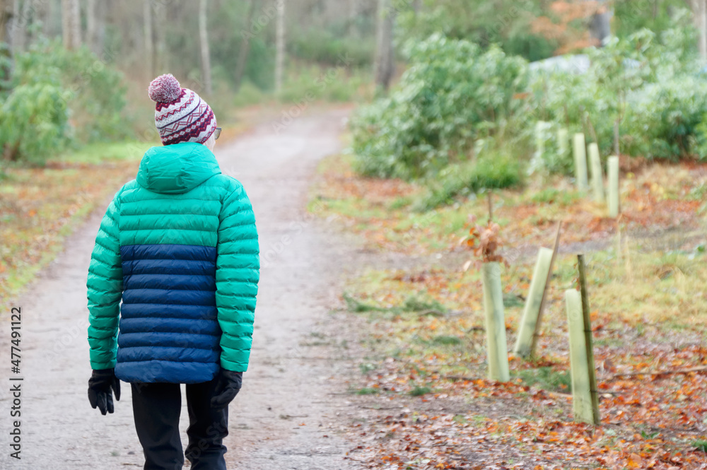 Single elderly woman walking alone in forest during lockdown for good mental and physical health