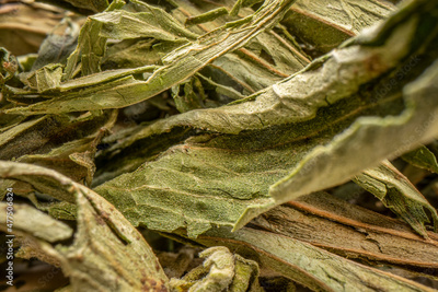 stevia dried leaves - natural sweetener, sugar substitute, macro shot with a probe lens