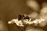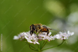 A hover fly, which looks almost like a bee, sits on a hemlock flower against a green background