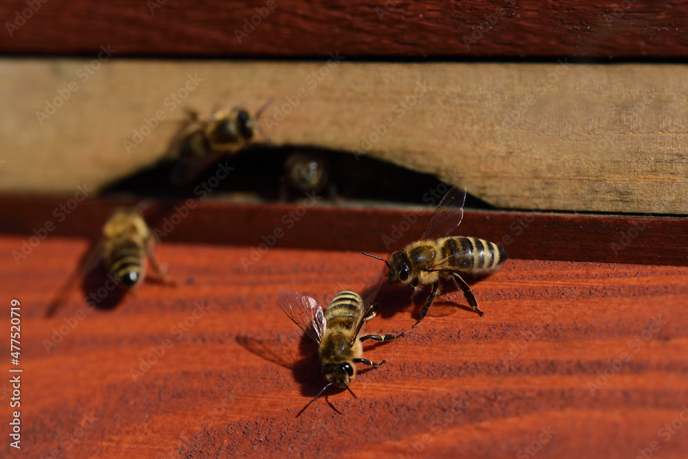 Close up of the entrance of a wooden beehive with a couple of bees coming out of it