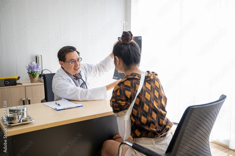 The doctor is explaining about the brain X-ray results to a female patient in his office at Hospitals