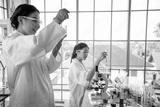 Medical Research and Scientists are working with a microscope and a tablet and Test Tubes, Micropipette and Analysis Result in a laboratory.