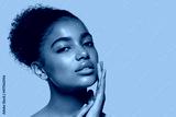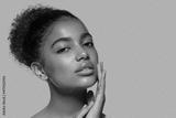 Beauty woman black skin face smiling model touching her face. Color background. Green