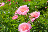 Pink flowering peonies in a spring botanical garden at sunny day. Fragrant open and unopened flower buds in green lush leaves in flower bed at summer. Floriculture, horticulture concept. Springtime.