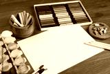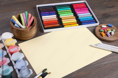 Blank sheet of paper, colorful chalk pastels and other drawing tools on wooden table. Modern artist's workplace