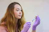 Young white woman nurse in pink robe purple gloves is taking hyaluronic acid filler into syringe for an injection. A cosmetic beautician doctor. Beauty Injection, plastic surgery, spa, care concept.