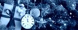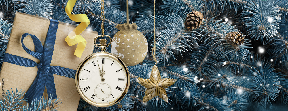 New Year Christmas banner. Gift box with blue ribbon and gold New Year's Eve watch on christmas tree