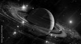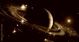 Saturn planet with rings in outer space among star dust and srars. Titan moon seen. Elements of this image furnished by NASA.