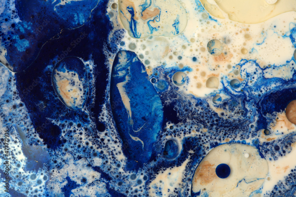 Abstract blue and beige bubble blot and drops horizontal background. Marble texture. Acrylic color in water and oil.