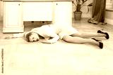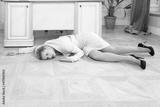 Crime scene with strangled pretty business woman in office..