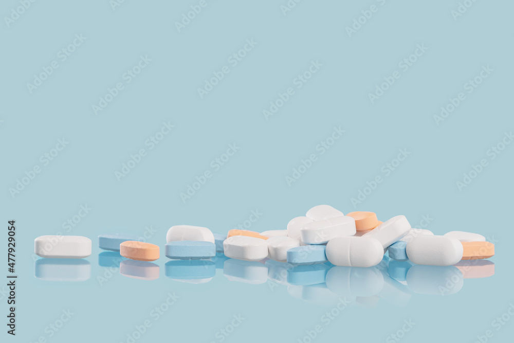 Medical background. many capsule tablets or pills on blue table. Close up. Healthcare pharmacy and medicine concept with copy space Painkillers or prescription drugs consumption