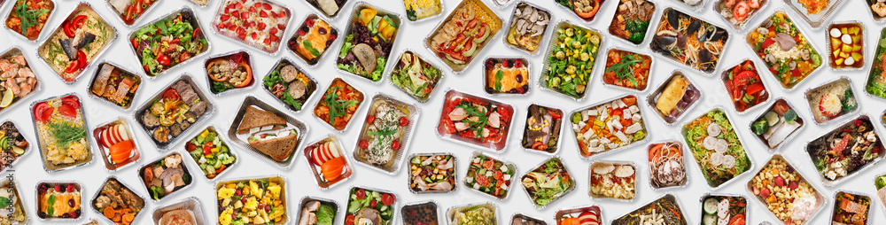 Creative Banner For Food Delivery With Prepared Healthy Meals In Foil Containers