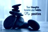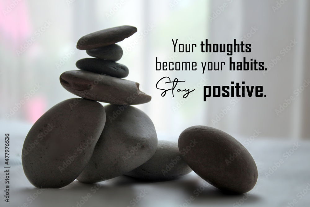 Life balance inspirational quote - Your thoughts become your habits. Stay positive. With zen stones on light white background. Attitude, life positive thinking and positivity concept.