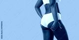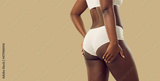 Plus size black model posing in underwear. Brown skinned woman wearing comfy natural cotton panties holding hands on bottocks standing on beige color background. Female body concept, rear back view
