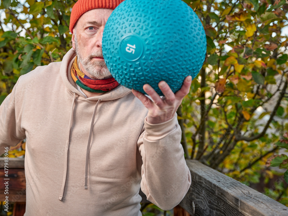 senior male (late 60s) is exercising with a heavy slam or medicine ball in his backyard, chilly afternoon in fall scenery
