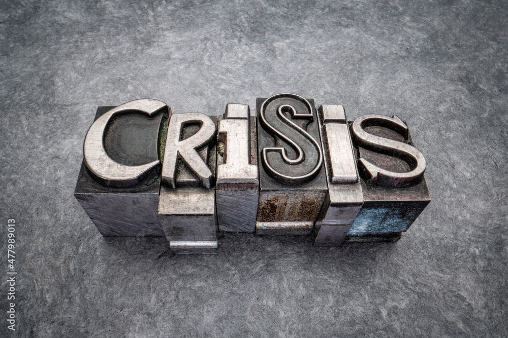 crisis word abstract in gritty vintage letterpress metal types, mixed fonts against handmade bark paper, trouble, emergency or trauma concept