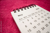 May 2022 - spiral desktop calendar against textured handmade paper, low angle macro shot, time and business concept
