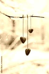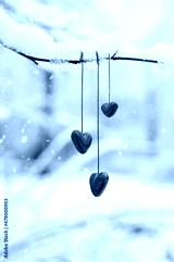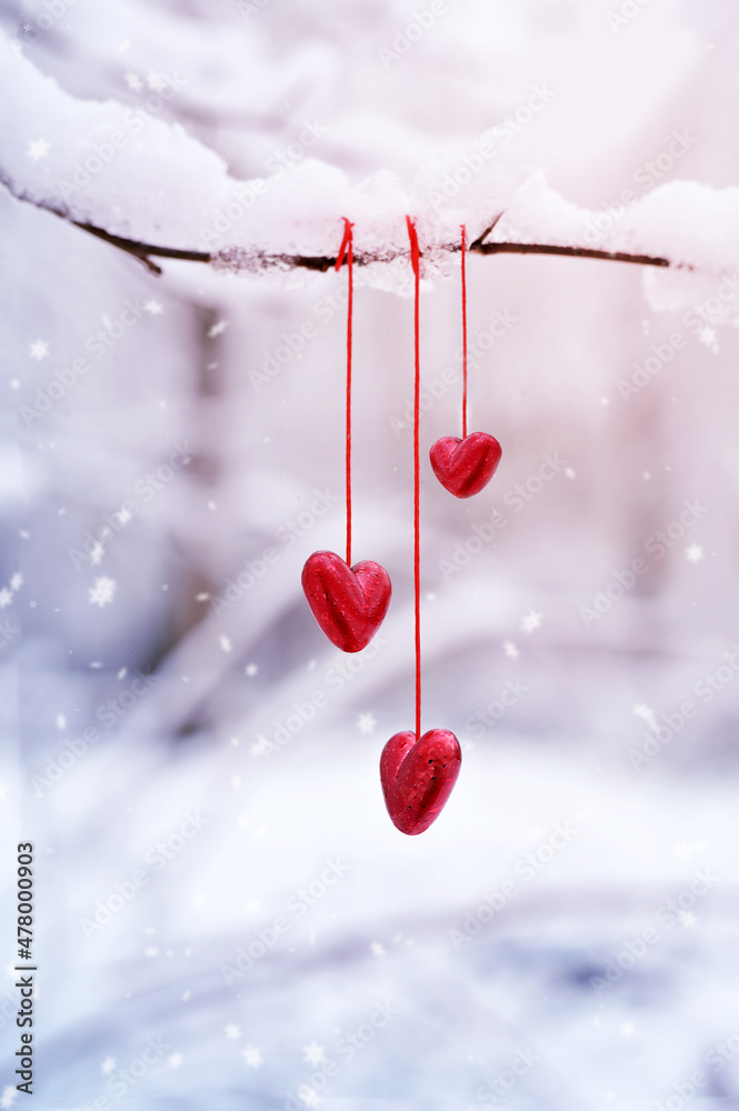 Red hearts on snowy tree branch in winter. Holidays happy valentines day. Love concept.
