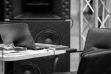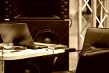 Open laptop screen behind desktops in office