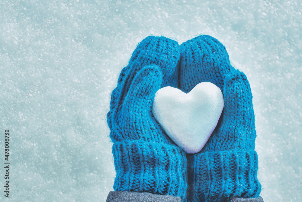 Female hands in knitted mittens with heart of snow in winter day. Love concept. Valentine day background.