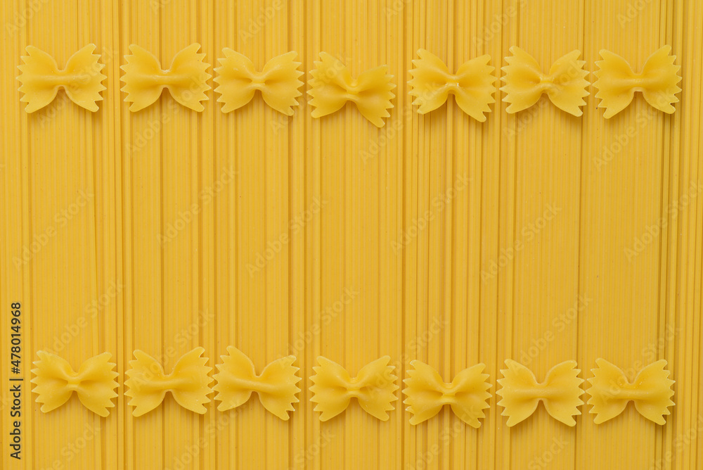 Background made of resting spaghetti lying next to each other and on which Farfalle are draped