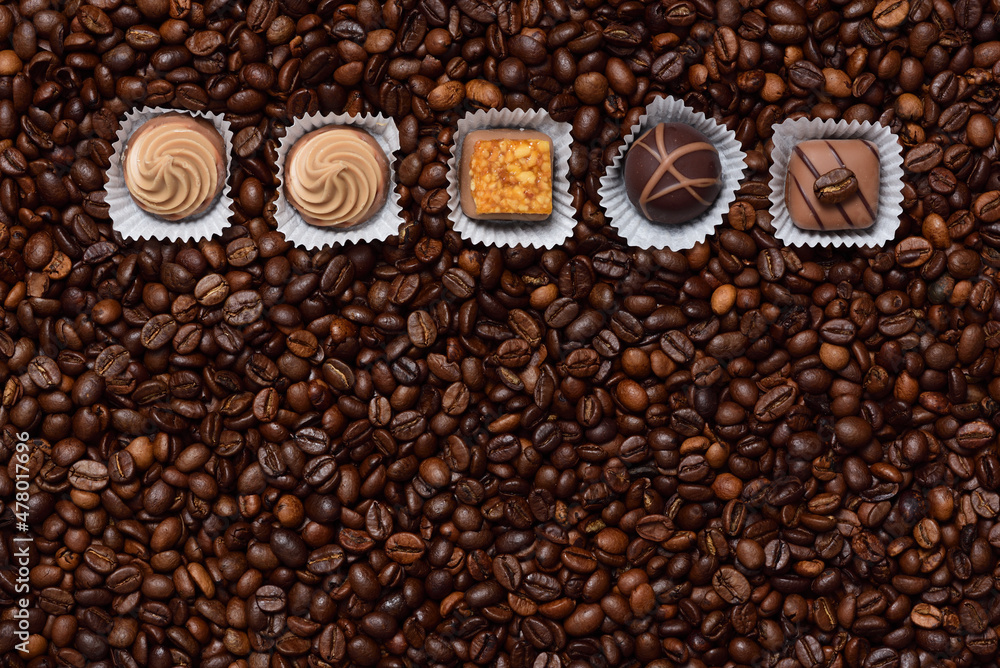 Many roasted coffee beans are lying next to each other. Fresh pralines lie on top of it