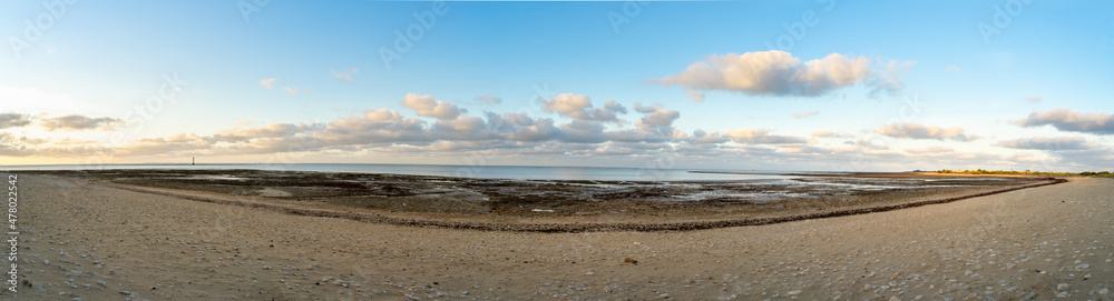 Panoramic view of Re island beaches at sunrise with a very calm sea. beautiful minimalist seascape