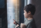Portrait of school boy standing next to window and using his finger drawing or writing on window glass, Side view of child hand drawing on glass, Toddler boy looking at him self through window.