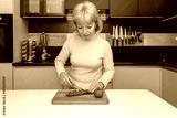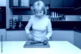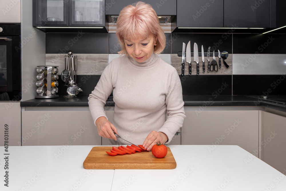 Woman housewife cuts red tomatoes with a knife on a cutting wooden board, close-up.