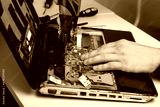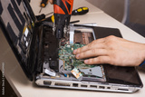 The wizard restores the laptop. Disassembly of the laptop into spare parts. Board, part of laptop for recovery. Maintenance of computer equipment using tools. View of the laptop inside