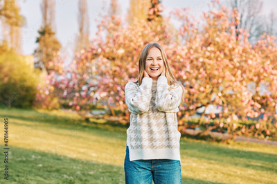 Outdoor portrait of young happy blond woman in spring park, emotional female model having fun on sunny warm day