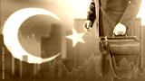 Turkish currency crisis. Exchange value of money to Turkey. Turkish republic flag with crisis charts. Economic devaluation in Turkey. Devaluation of financial system in Turkey. Man with suitcase