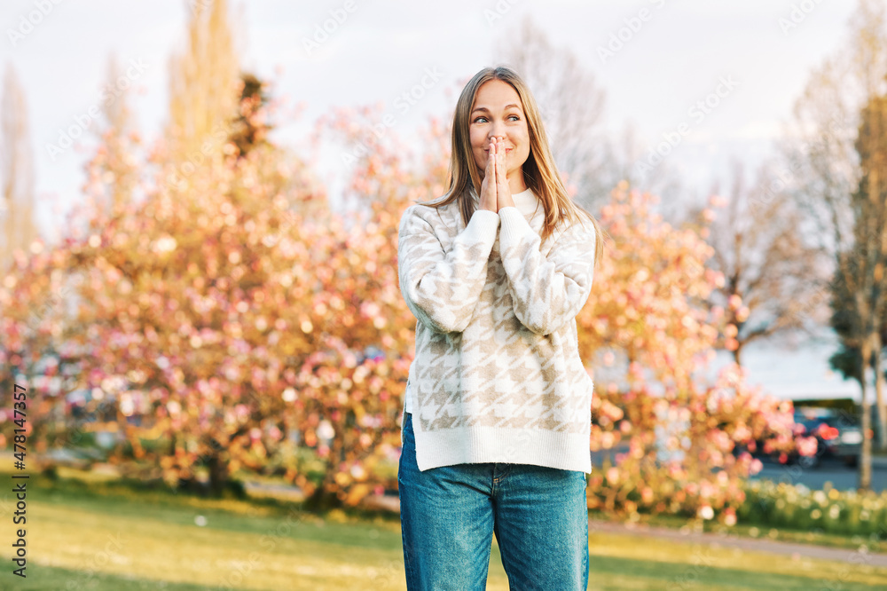 Outdoor portrait of young happy blond woman in spring park, emotional female model having fun on sunny warm day, holding hands next to face, looking aside