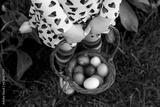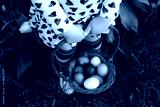 Close-up of legs of toddler girl with colorful stockings and shoes and basket with colored eggs. Child having fun with traditional Easter eggs hunt, outdoors. Celebration of christian holiday.
