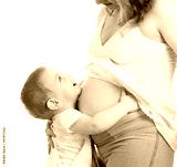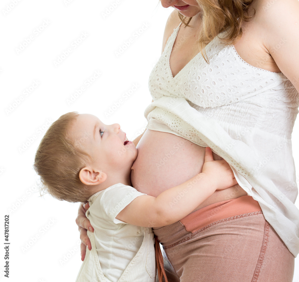 Little boy hugging pregnant mother's belly and looking up