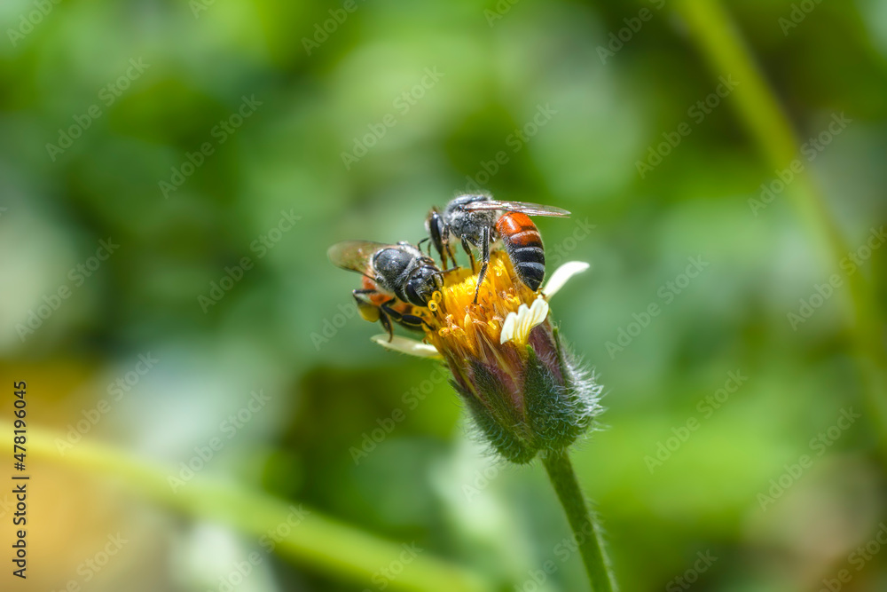 Two Bee fighting for collect nectar at yellow flower on natural blur yellow flower field background, Bee flying over the yellow flower in blur background.