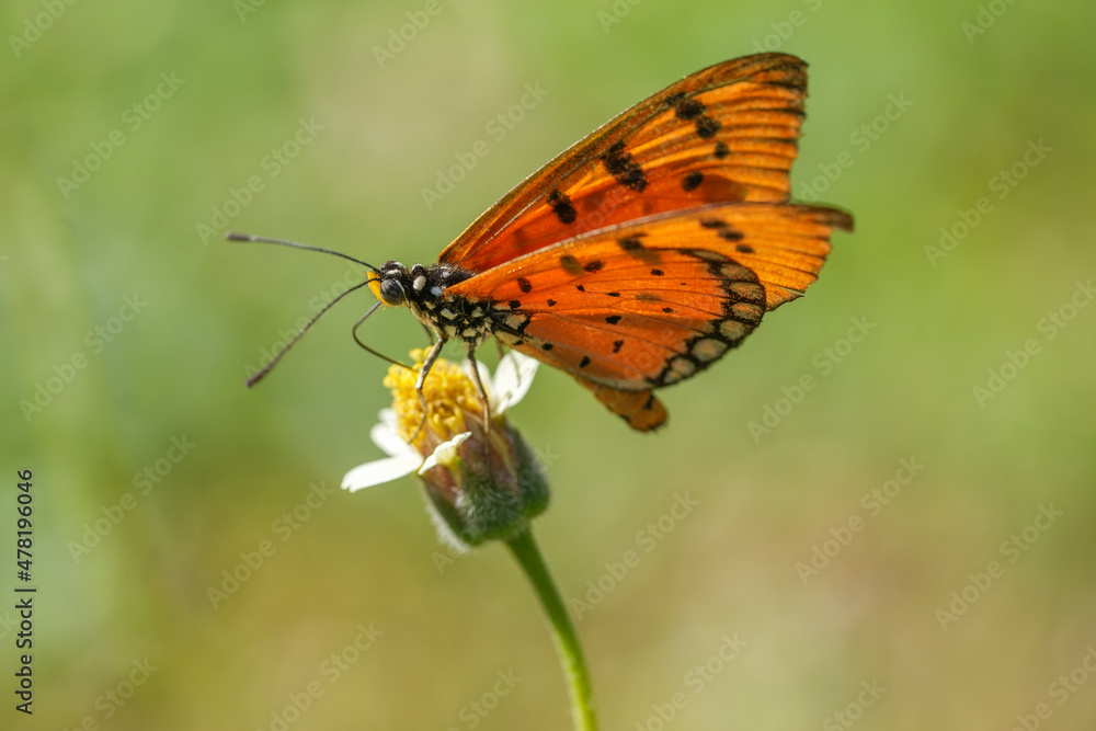 Orange butterfly feeding on lovely yellow flowers in blur garden background, Butterfly collecting pollen at yellow flower.
