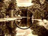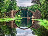 Rakotz Bridge, Rakotzbrucke in Kromlau, Saxony, Germany. Fantastic landscape in Azalea and Rhododendron Park Kromlau. Reflection of bridge in water of Rakotzsee. traveling and travel goals for tourism
