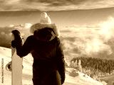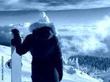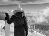 CLOSE UP: Female snowboarder observes alpine landscape before riding off piste
