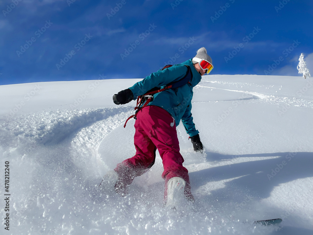Woman on snowboarding vacation in Alps smiles while shredding champagne powder.