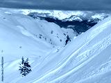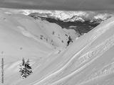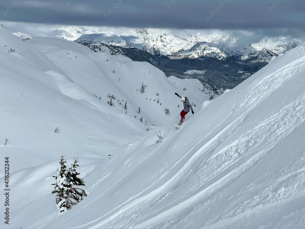 Action shot of a young female snowboarder riding down a steep ungroomed slope.