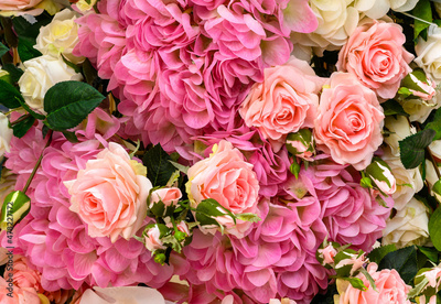 Rose and hydrangea flowers, top view of large bouquet of artificial flowers