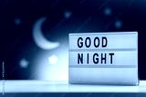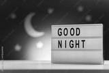 sleeping and bedtime concept - close up of customizable light box with good night words over moon and night stars on blue background