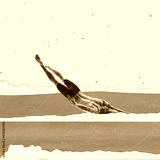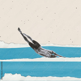 Contemporary art collage. Sportive young man diving into torn paper water isolated over pastel background with dust effect