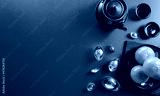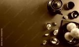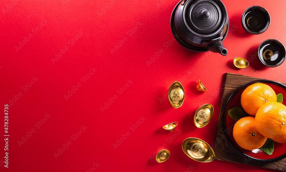 Chinese new year decorations made from red packet, orange and gold ingots or golden lump on a red background. Chinese characters FU in the article refer to fortune good luck, wealth, money flow.